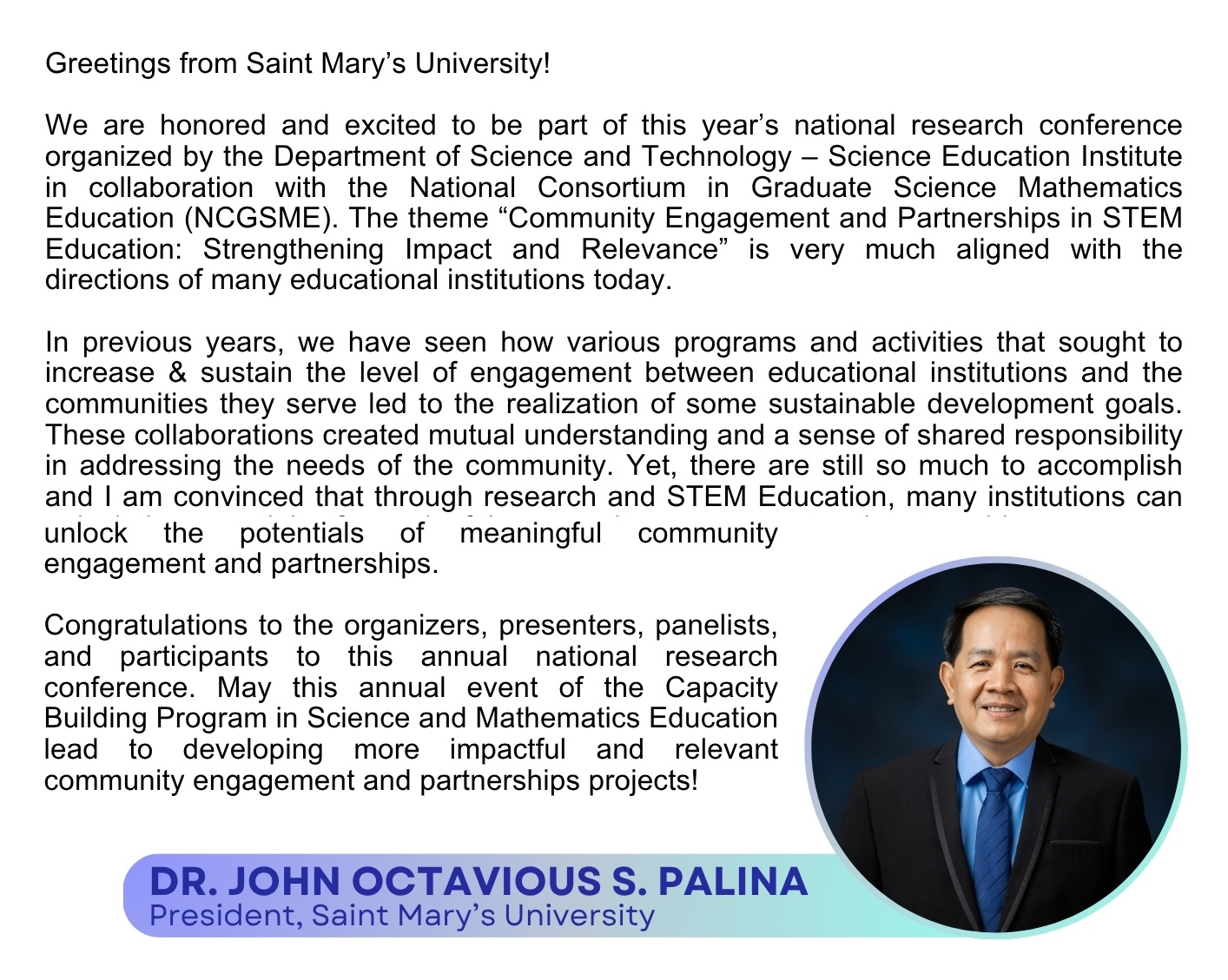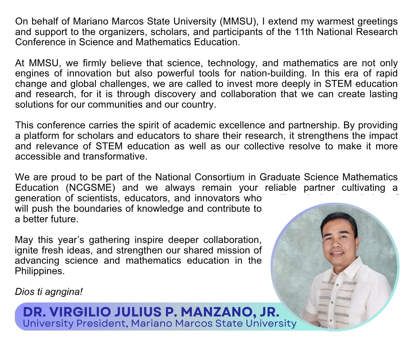 The National Consortium in Graduate Science and Mathematics Education (NCGSME) is a consortium of sixteen (16) universities in the Philippines that collaborates with the Department of Science and Technology - Science Education Institute (DOST-SEI):